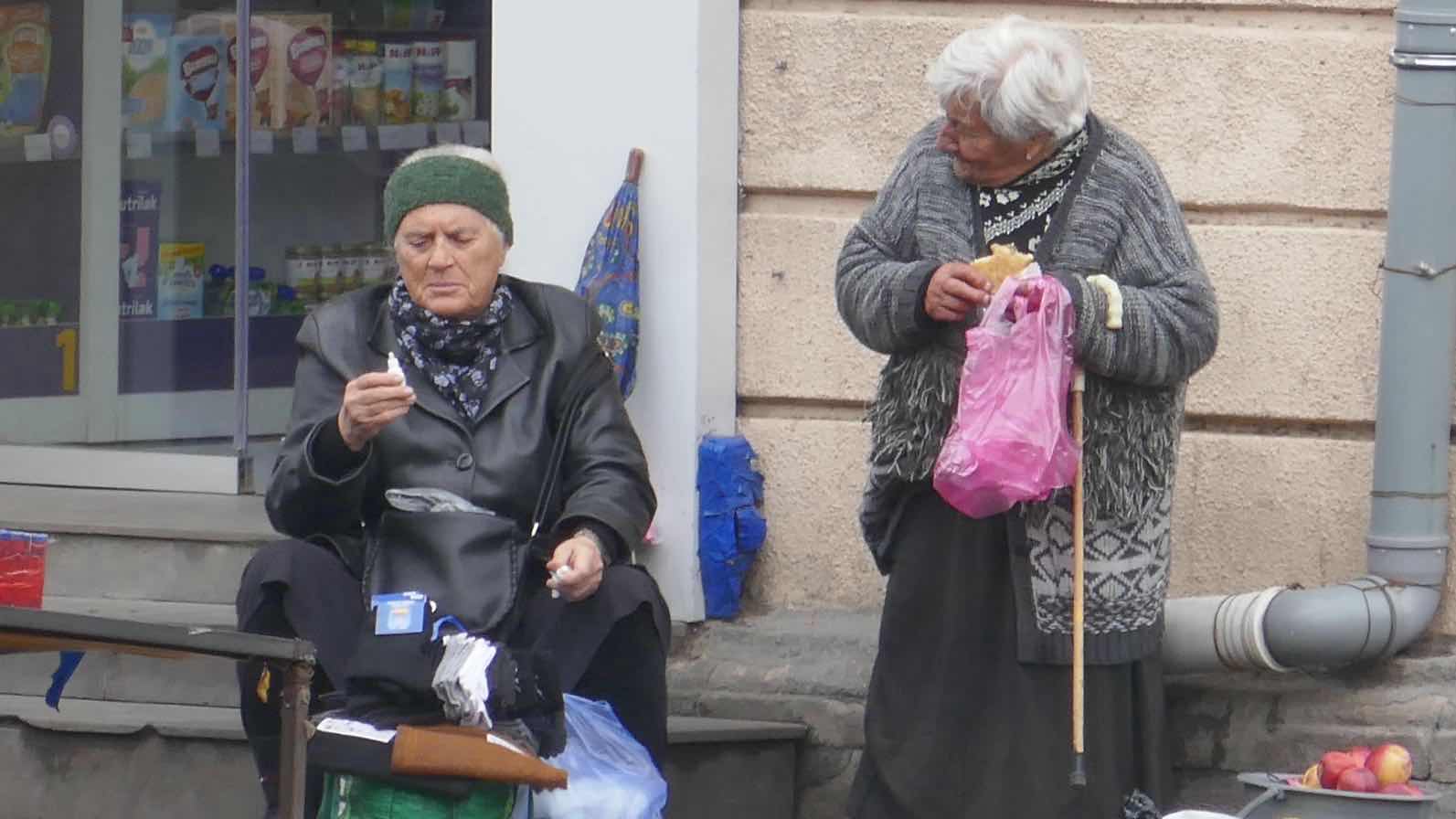 Vor dem danebenliegenden Supermarkt sitzen zwei Frauen, wahrscheinlich Roma. Sie lesen aus der Hand. Es ist wahrscheinlich nicht ungefährlich, sie zu fotografieren, ich versuche es aber trotzdem.